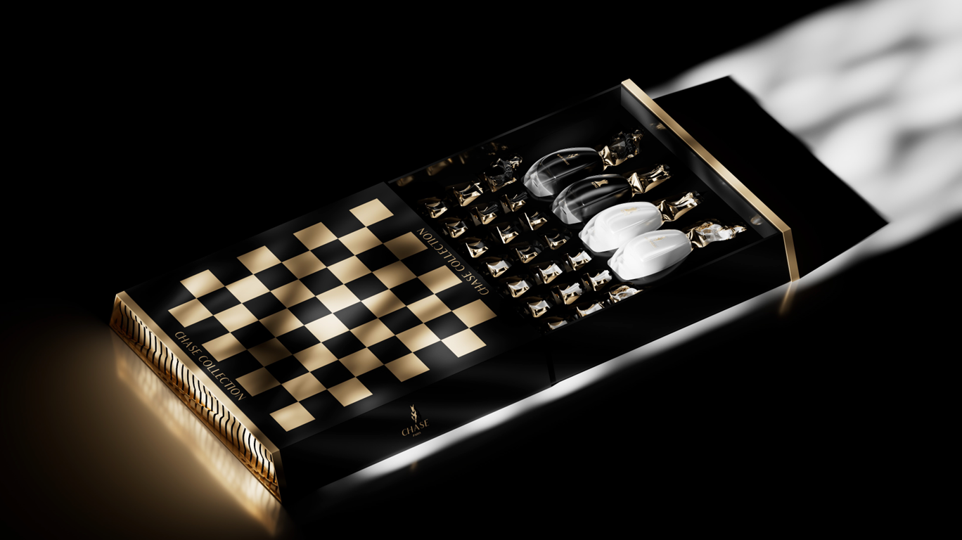 actual chess pieces. This unique feature transforms the perfume collection into a complete chess set, offering an interactive